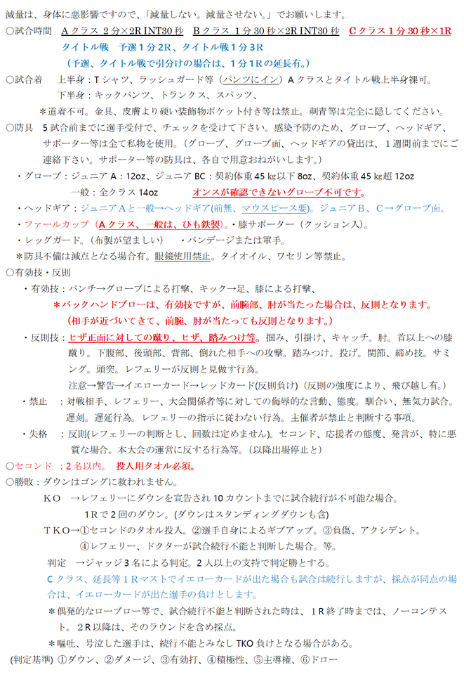 ・キャッチウエイトです。(対戦カードの重い方の選手の体重+1㎏を契約体重とします。2試合の選手が絡む場合は、一番重たい選手の体重+1㎏です。正式な対戦表に記載させて頂きます。)