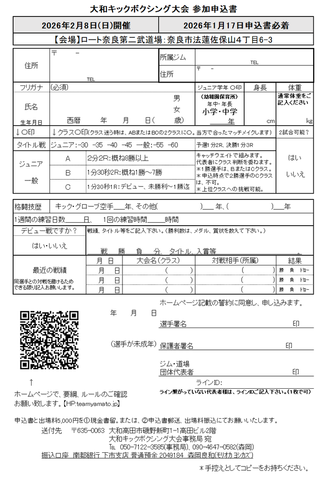本大会の実施要項、ルールに従い正々堂々競技することを誓います。大会中は、主催者・スタッフの指示に従い、レフェリー・ジャッジの判断・判定に異議申立てをしません。試合においての怪我・死亡等については自己の責任とし、対戦相手・主催者・大会関係者に一切の責任がないものとします。本大会の画像等は主催者に帰属することを認めます。申込書の記載に虚偽の無いことを誓います。最後に大会の開催運営に誠意を持って協力します。